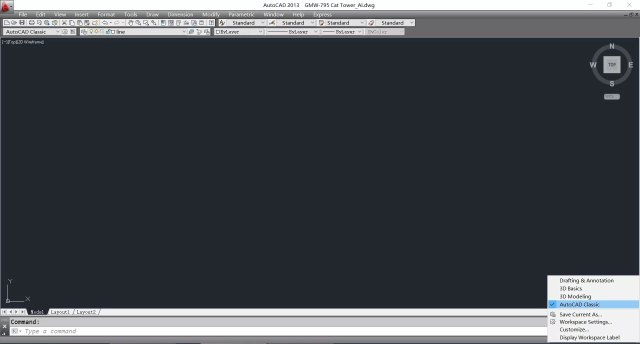 一、设置经典工作界面,以下以AutoCAD12013为例,在打开的界面点击右下角的齿轮图标,在弹出的菜单中选择"AutoCAD Classic"。