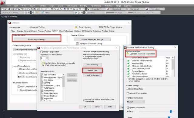 二、硬件加速,(高配置电脑用高版本CAD显著加速) 和3D,SU等一样,CAD也能硬件加速。这点低版本无所谓,2012以后效果明显。开启方法:工具->选项>系统,点性能设置在弹出的对话框中点击“手动调节” ,在弹出的对话框中勾上硬件加速即可。(此方式能解决画图时遇到鼠标移动顿卡问题)
